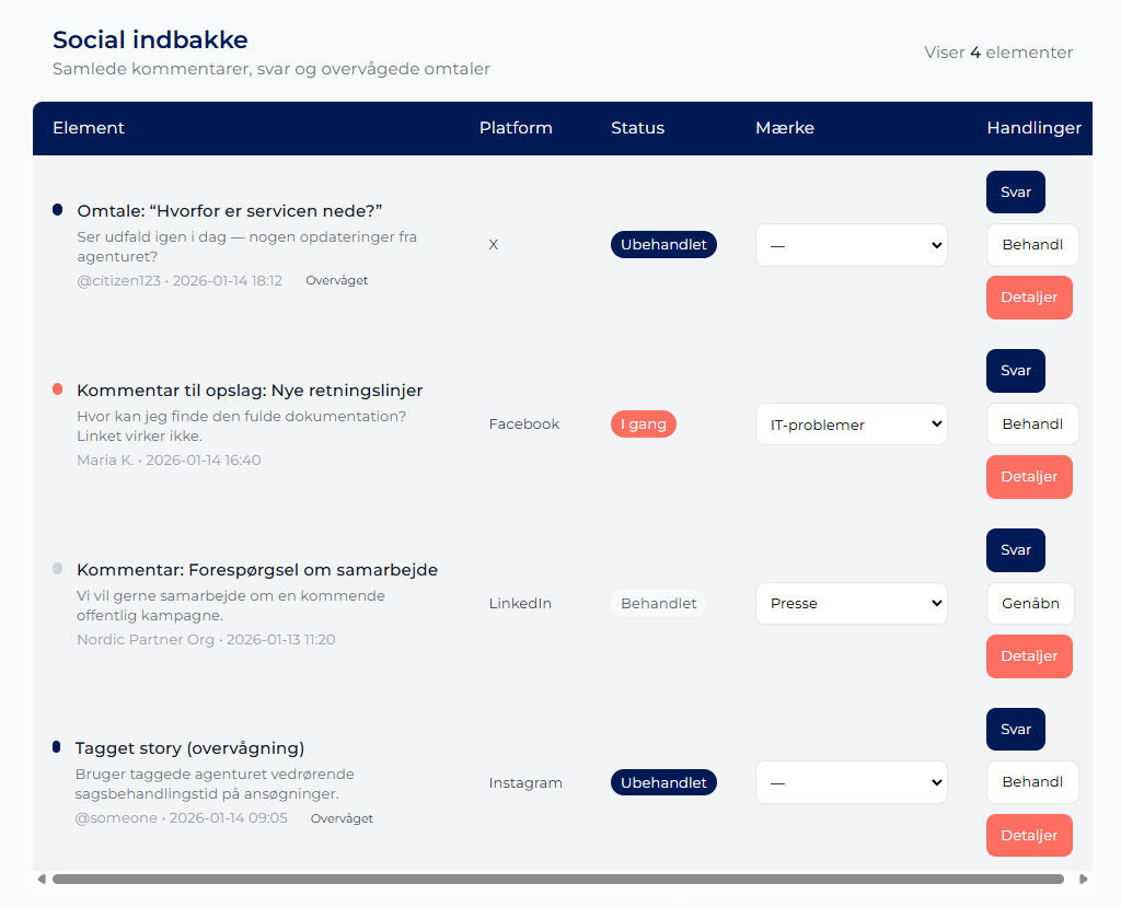 Systemet viser tydeligt, hvilke kommentarer og opslag der endnu ikke er besvaret eller håndteret. Det gør det nemt at prioritere opgaver og sikre rettidig opfølgning, også i større organisationer med mange brugere.
