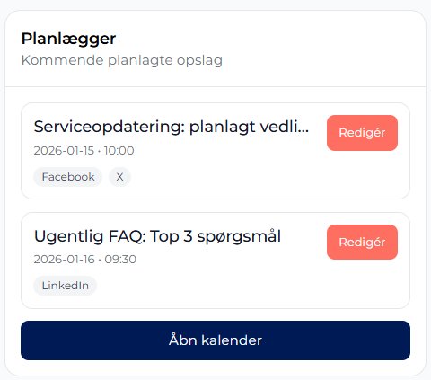 Se jeres sociale aktiviteter på mobil, tablet eller desktop. Dashboardet tilpasser sig automatisk jeres skærm og giver overblik, uanset hvor I arbejder fra.