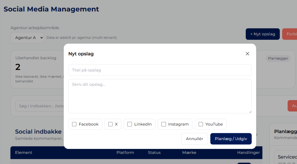 Alle kommentarer, svar og henvendelser samles ét sted. Det gør det nemt at bevare overblikket og sikre, at ingen dialoger bliver overset, uanset om de kommer fra Facebook, LinkedIn, Instagram, X eller YouTube.